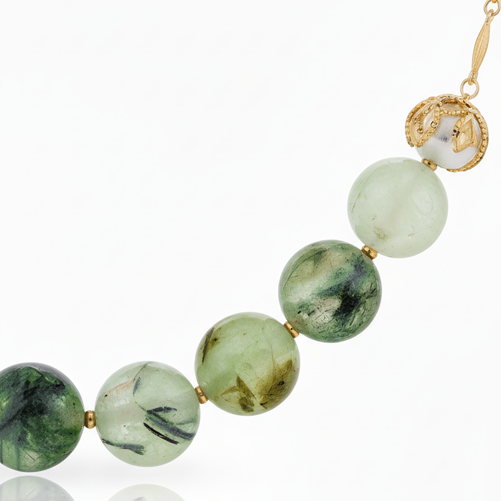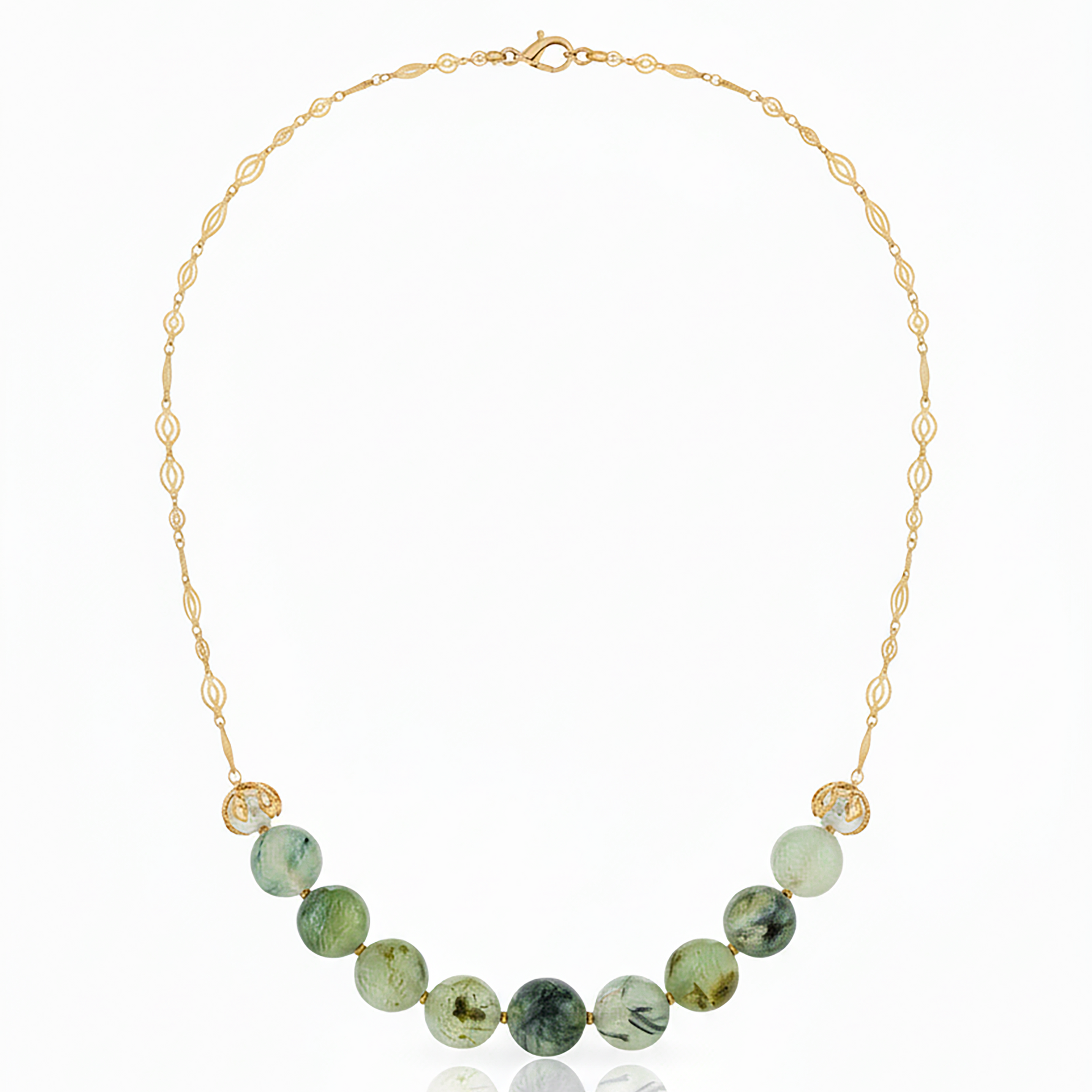 The Althea Necklace embodies elegance and the soothing energy of natural healing. Crafted from 925 sterling silver in 18k gold plating, this exquisite piece features 100% natural Prehnite stones, a symbol of harmony and elegance.
