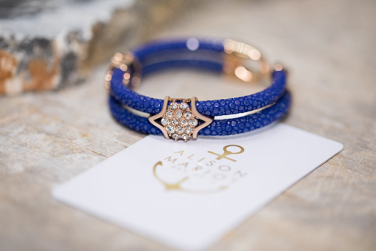Make a statement and your presence felt in any room with our Cobalt Blue Bracelet. Designed with the finest blue Stingray Leather and combined with our stainless steel emblem in 18k Rose-Gold Plating made of Cubic Zirconia White Crystals. This model creates an edgy and outstanding look that fits any outfit, from casual to professional!