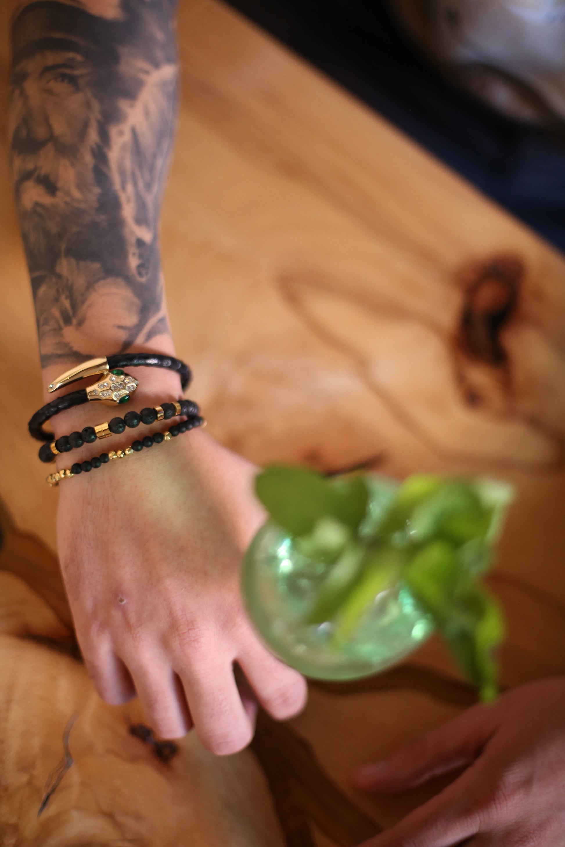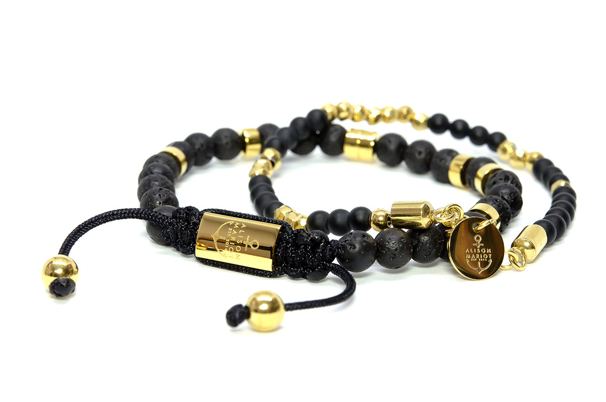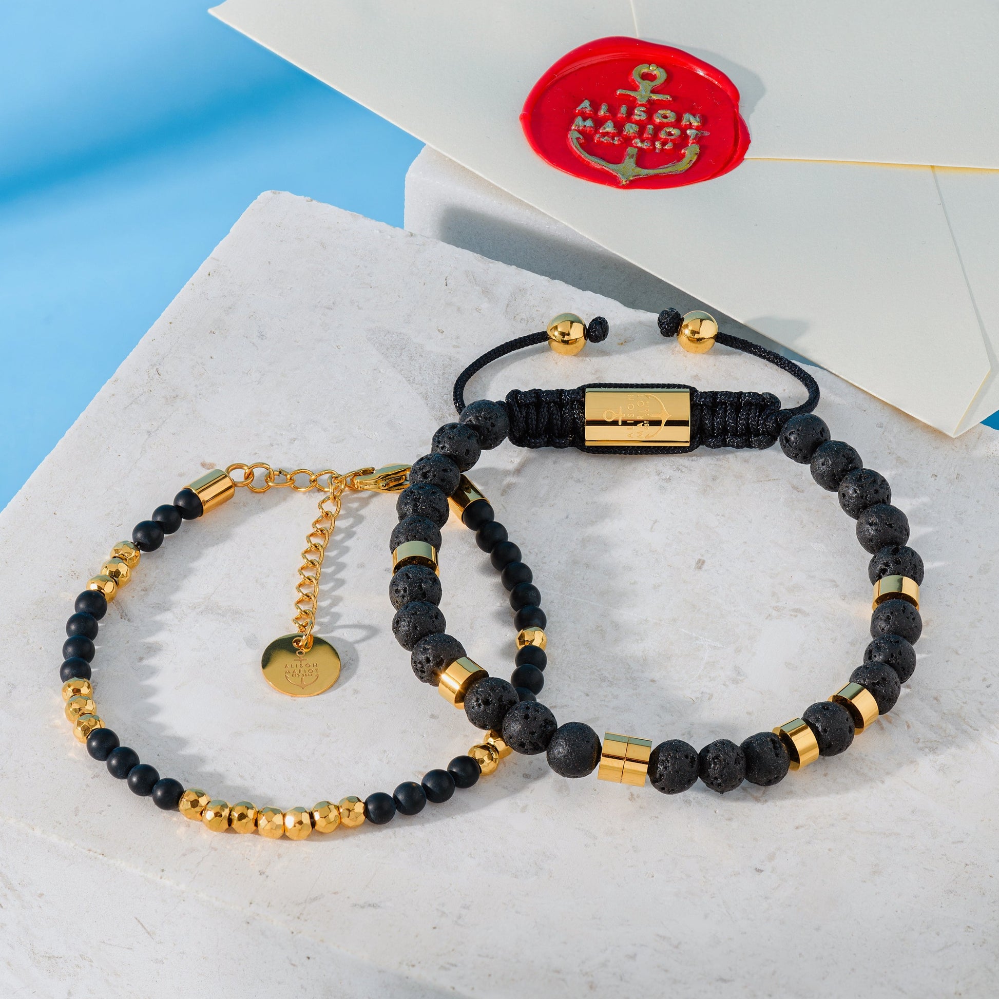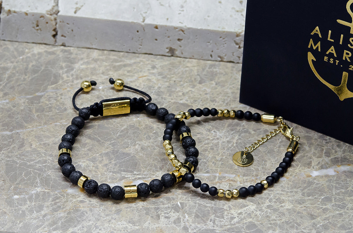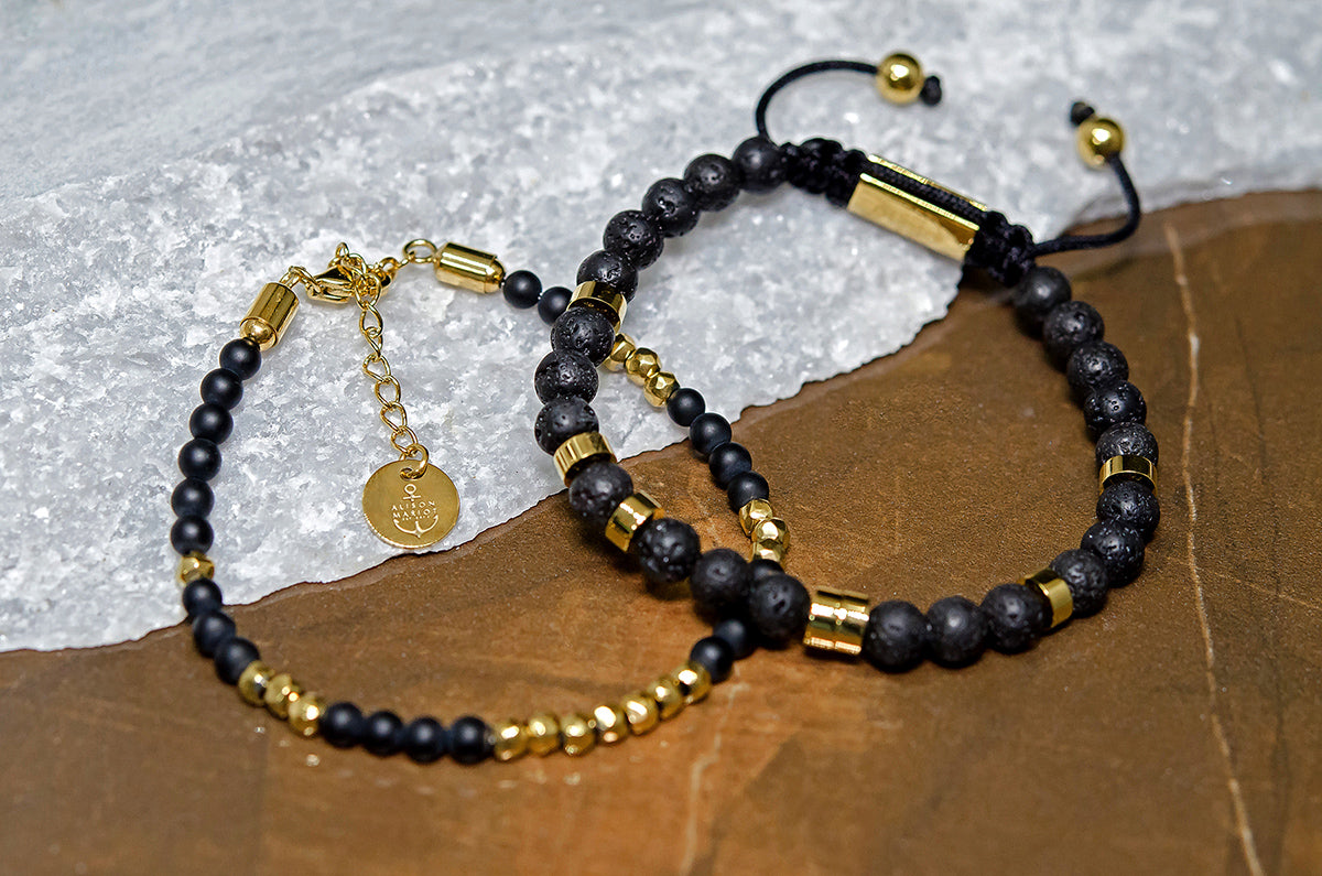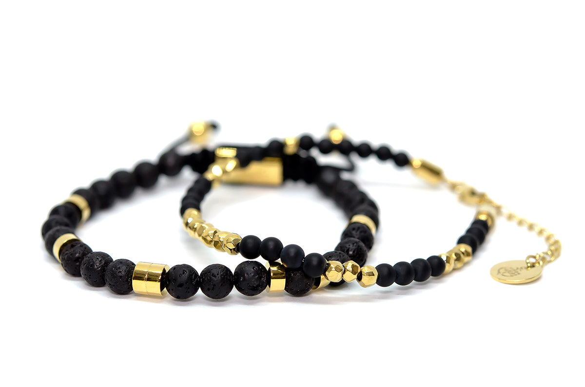 Make a statement and your presence felt in any room with our Essential Set. Designed with the 8mm Volcanic beads and combined with our Roller Beads in High Quality 18k Gold Plating. This model creates an edgy and outstanding look that fits any outfit, from casual to professional!
