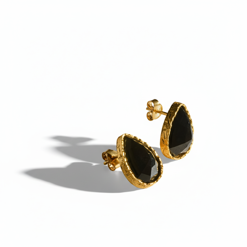 'Melani' earrings are a bold expression of elegance and inner strength. Named after the Greek word "Melani," meaning "black," this collection is crafted from 925 sterling silver, luxuriously plated in 18k gold, and adorned with 100% natural Black Onyx stones.
