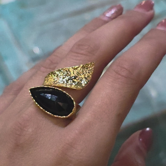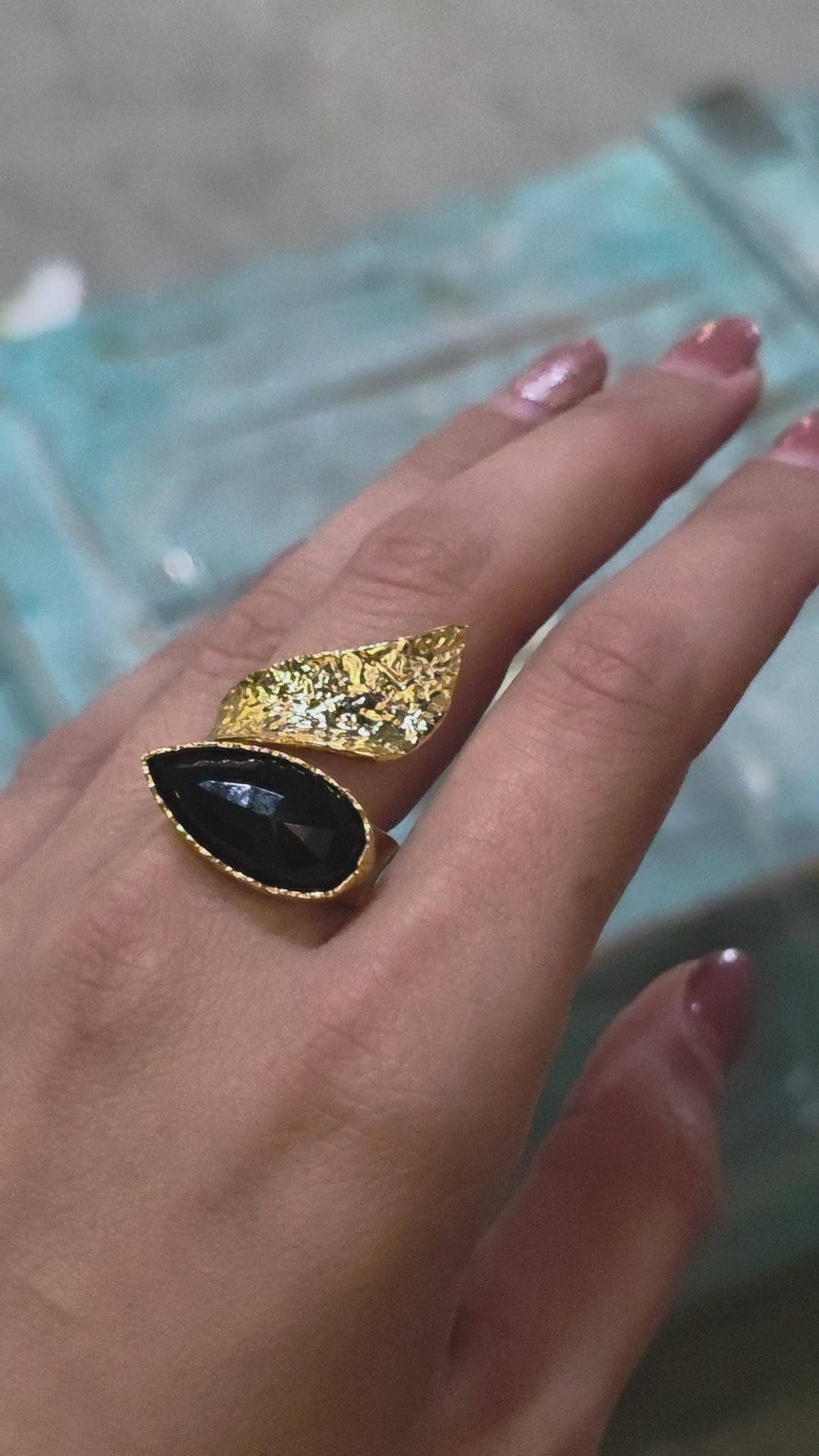 'Melani' ring is a bold expression of elegance and inner strength. Named after the Greek word "Melani," meaning "black," this collection is crafted from 925 sterling silver, luxuriously plated in 18k gold, and adorned with 100% natural Black Onyx stones.