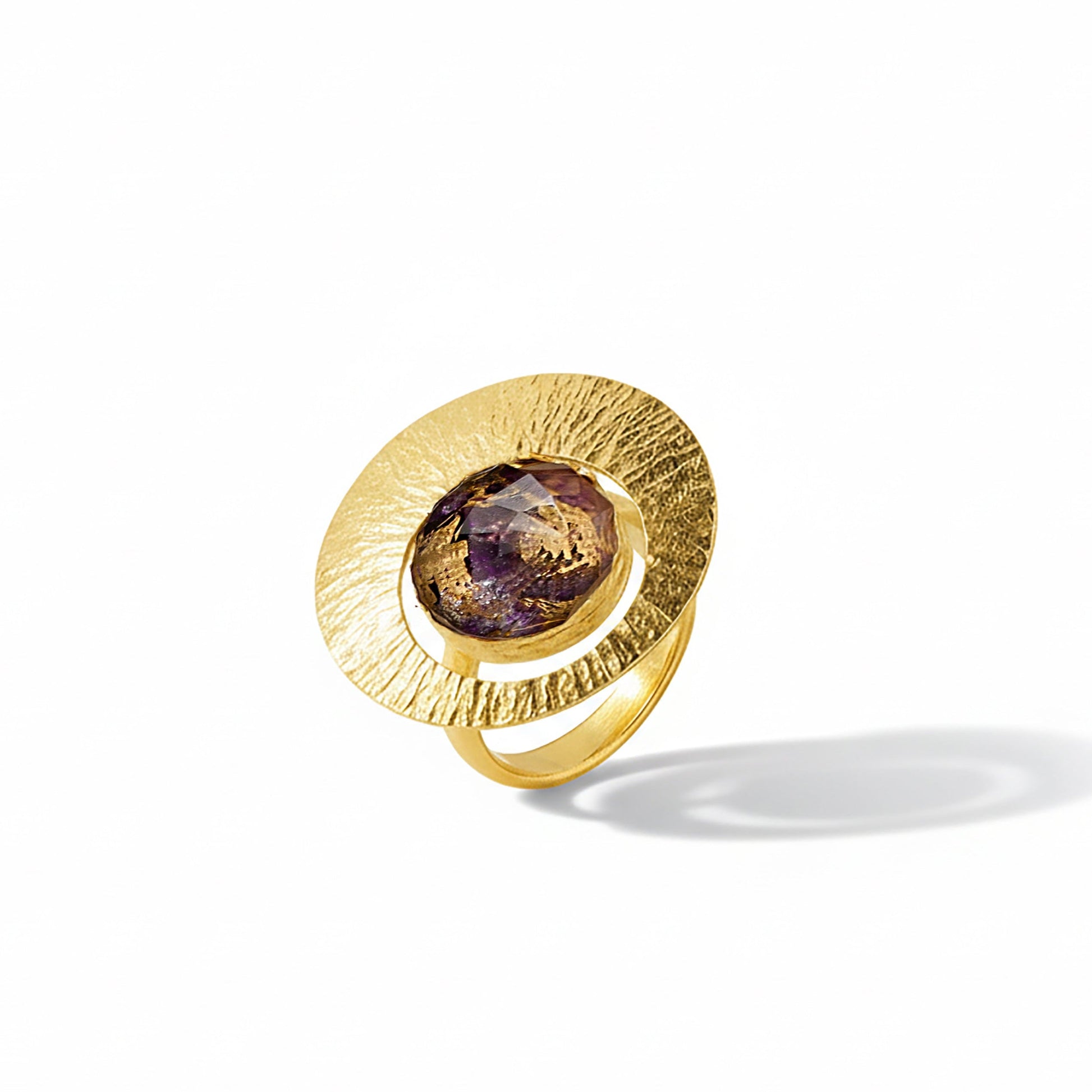 Nyssa Ring evokes the mystery and allure of ancient Greece inspired by timeless elegance with a modern touch. Crafted from 925 sterling silver and plated in 18k gold, this necklace showcase a captivating 100% natural amethyst copper stone. The deep, rich hues of the amethyst blend harmoniously with the warm gold tones, creating a piece that radiates both strength and beauty.
