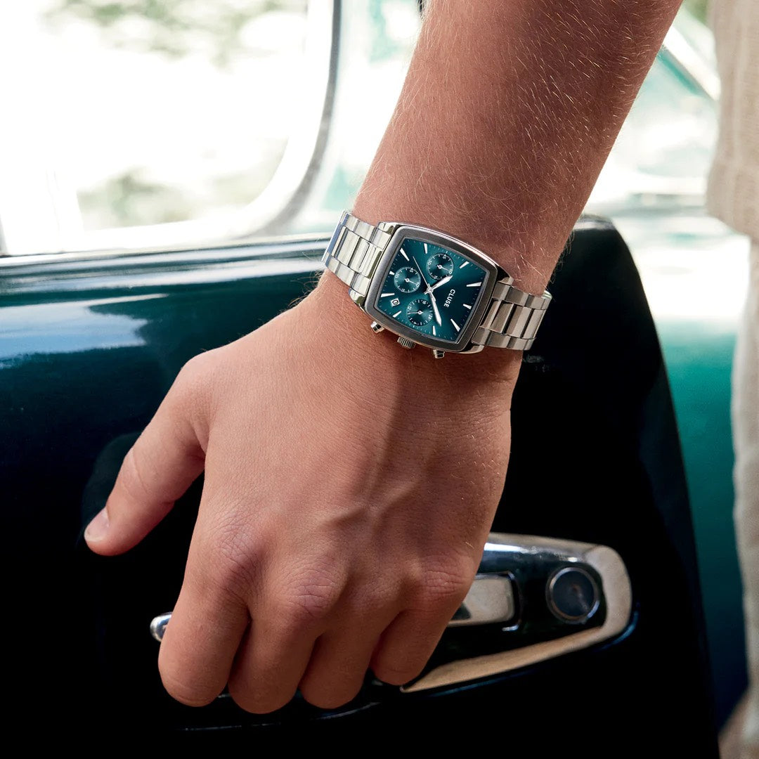 The Quartaut Chrono watch for men boasts a distinctive blend of strength and luxury. Featuring a streamlined silver coloured tonneau case, stainless steel 3-link strap and a blue dial with 3 subdials. Sculpted to perfection, offering both comfort and style. To adjust the strap, we recommend visiting your local jeweler.