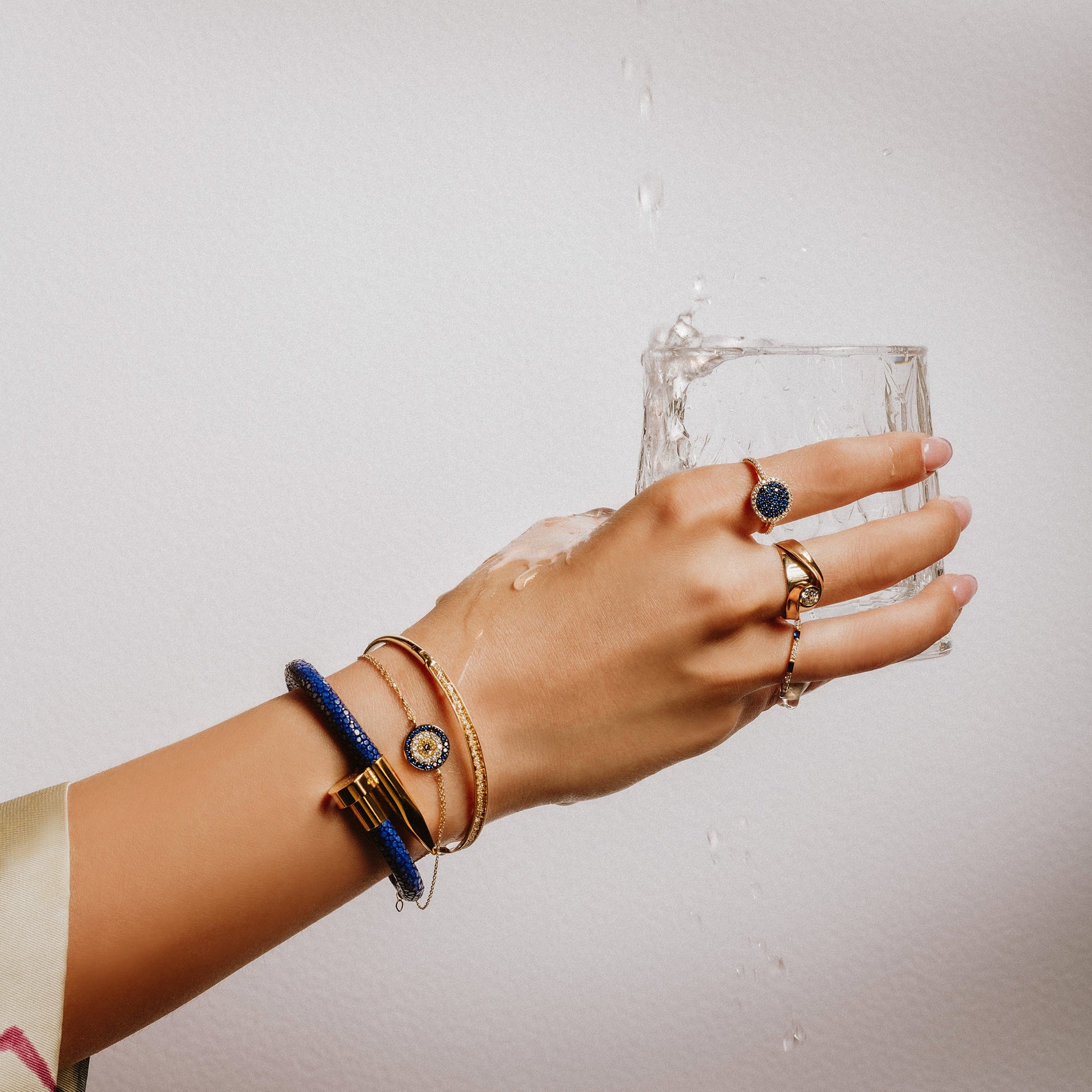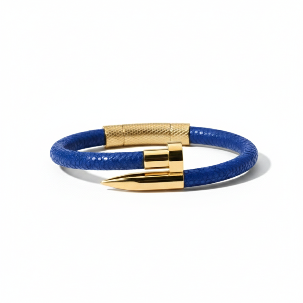 Të dizajnuar me lëkurë origjinale 'Stingray' blu dhe të larë me flori 18 karat, këto byzylykë sjellin një pamje elegante dhe unike që përshtatet në mënyrë perfekte me çdo veshje, nga ato të përditshme deri te ato profesionale.