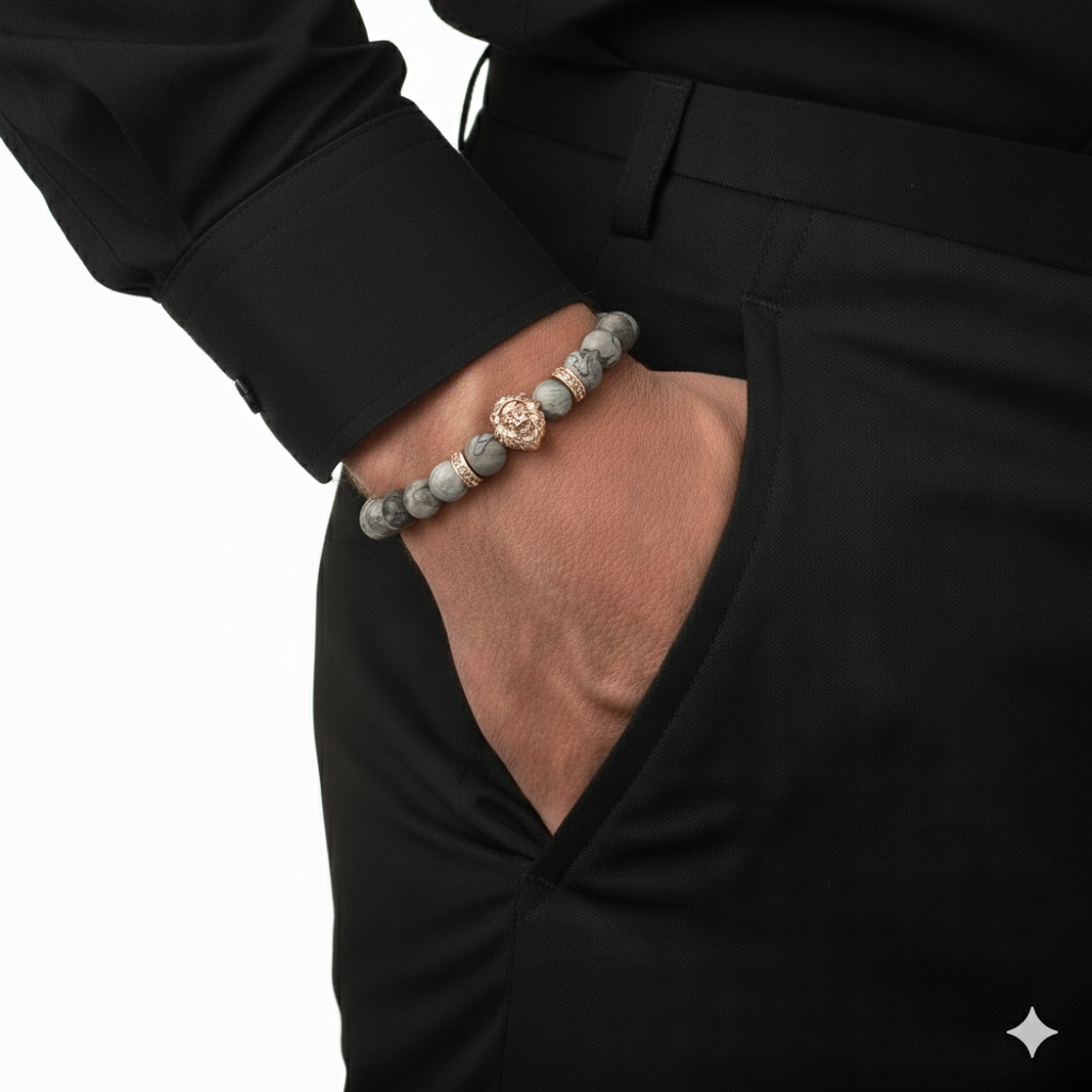 Duke kombinuar gurët natyralë 'Grey Jasper' me simbolikën e fuqishme të luanit, ky model përfaqëson forcë, kurajë dhe elegancë. Dizajni i tij i veçantë është krijuar për të tërhequr vëmendje në çdo rast.
