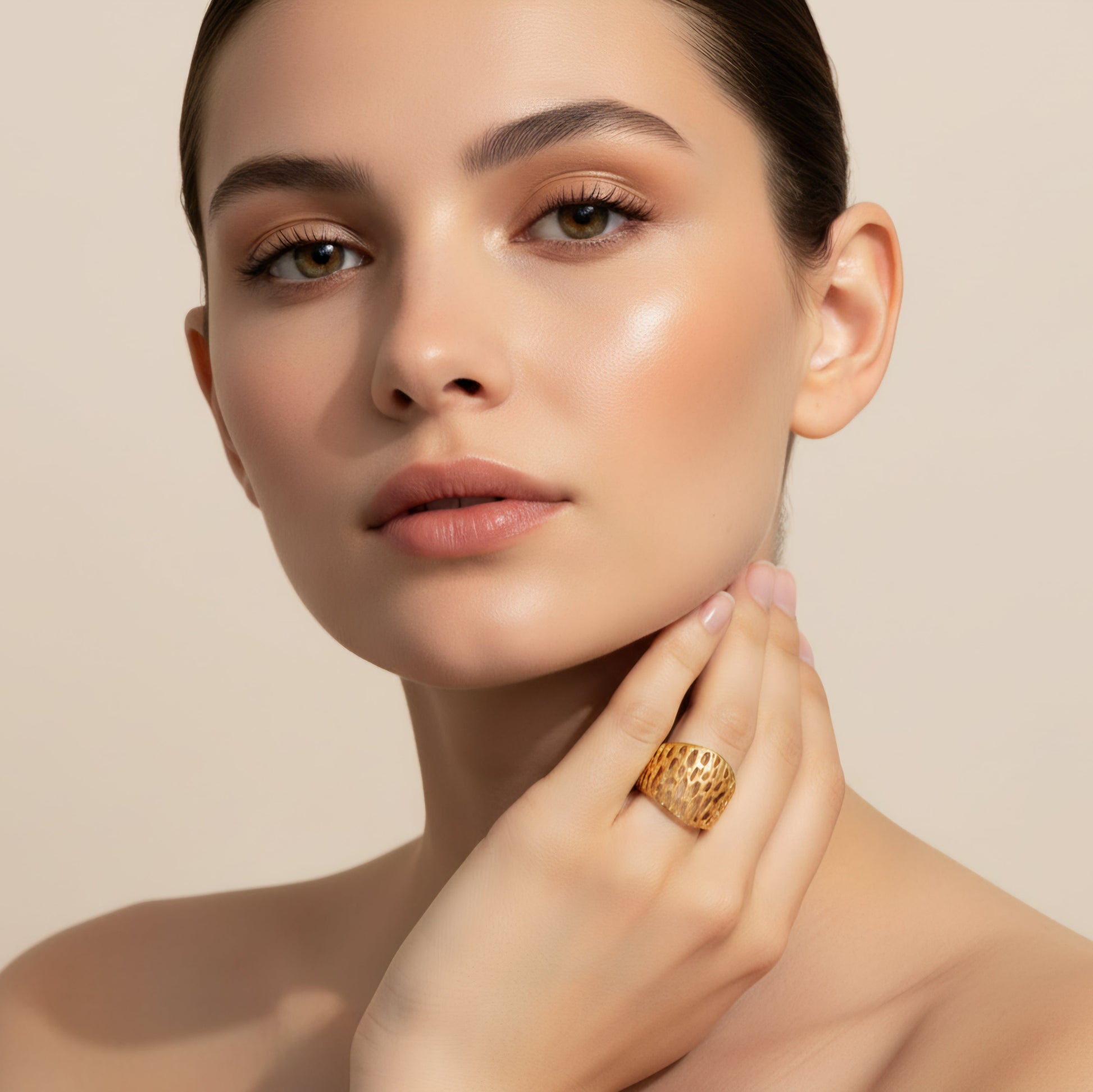 Sculpted from pure 925 Sterling Silver in 18k Gold Plated, the Photéa ring is a handcrafted masterpiece inspired by the dance of light and shadow. Its airy, openwork design catches the sunlight and releases it in delicate reflections across the skin. A true fusion of light, form, and soul. Bold, breathable, and effortlessly refined.