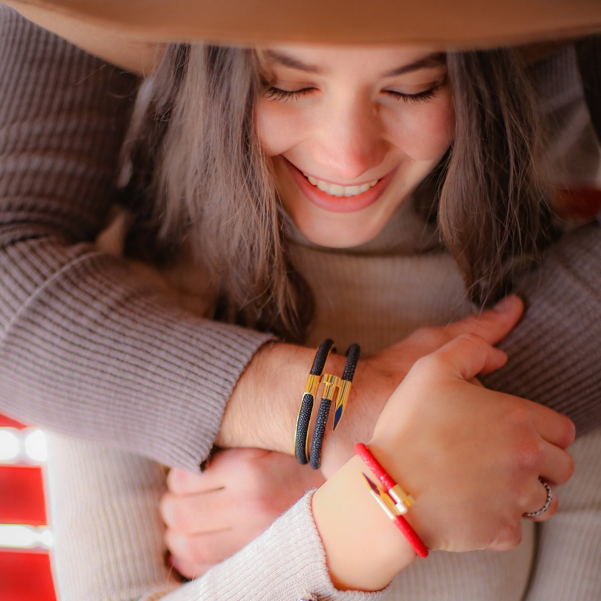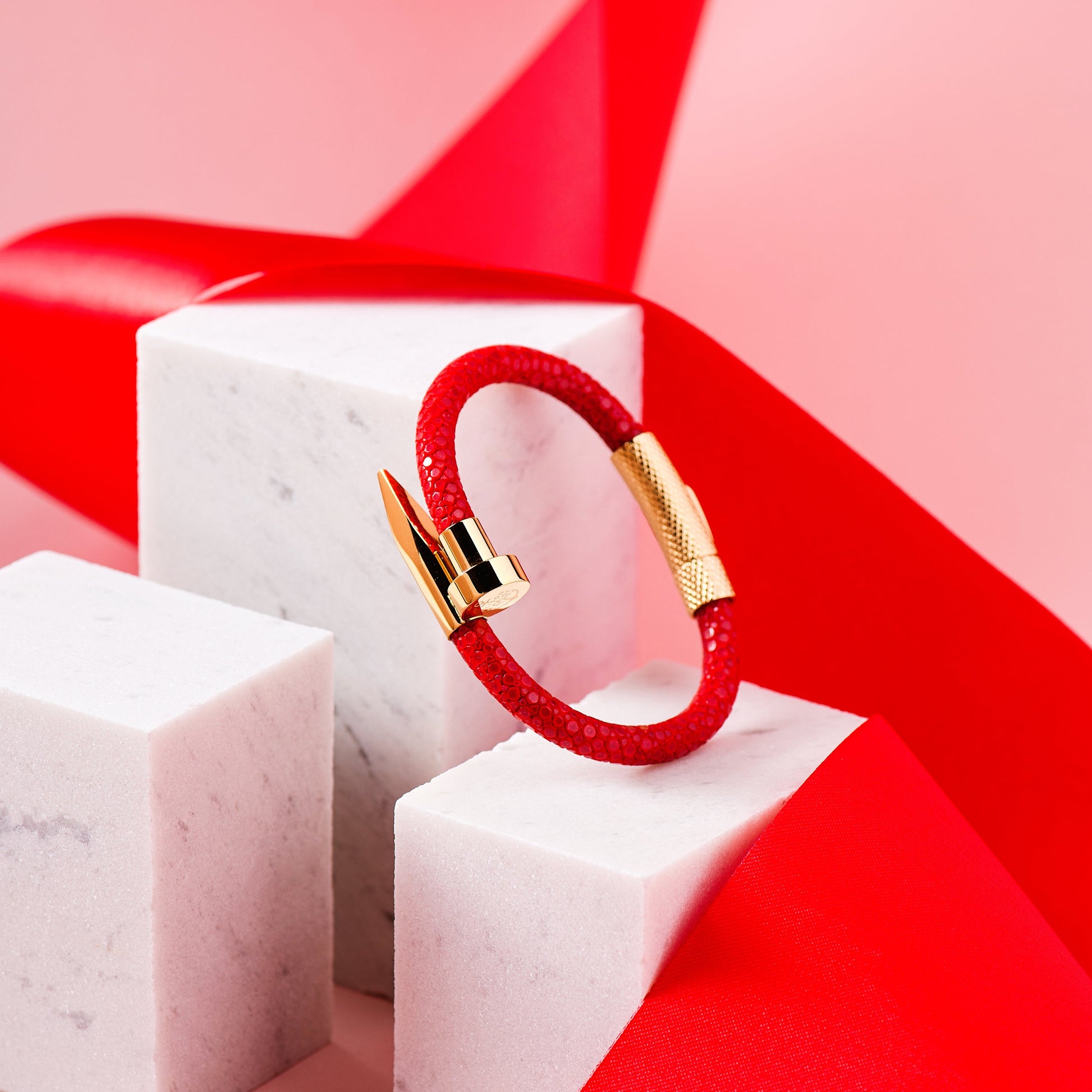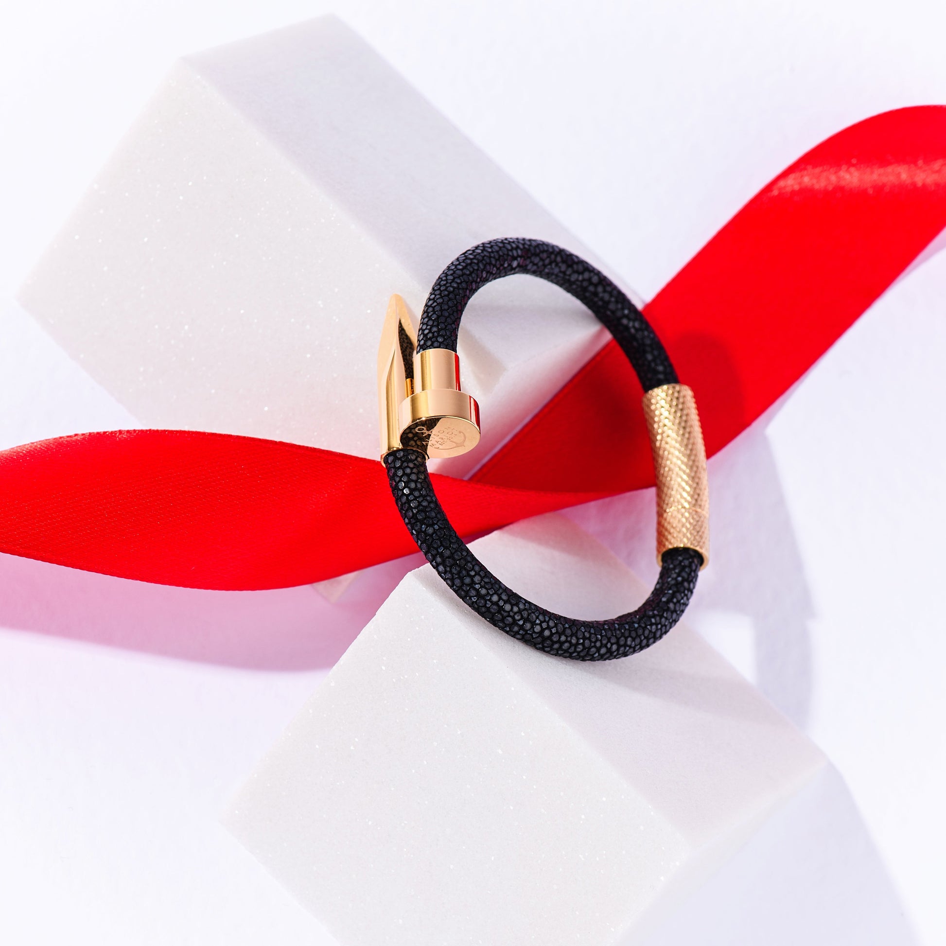 Të dizajnuar me lëkurë origjinale 'Stingray' të zezë, të kuqe dhe të larë me flori 18 karat, këto byzylykë sjellin një pamje elegante dhe unike që përshtatet në mënyrë perfekte me çdo veshje, nga ato të përditshme deri te ato profesionale.